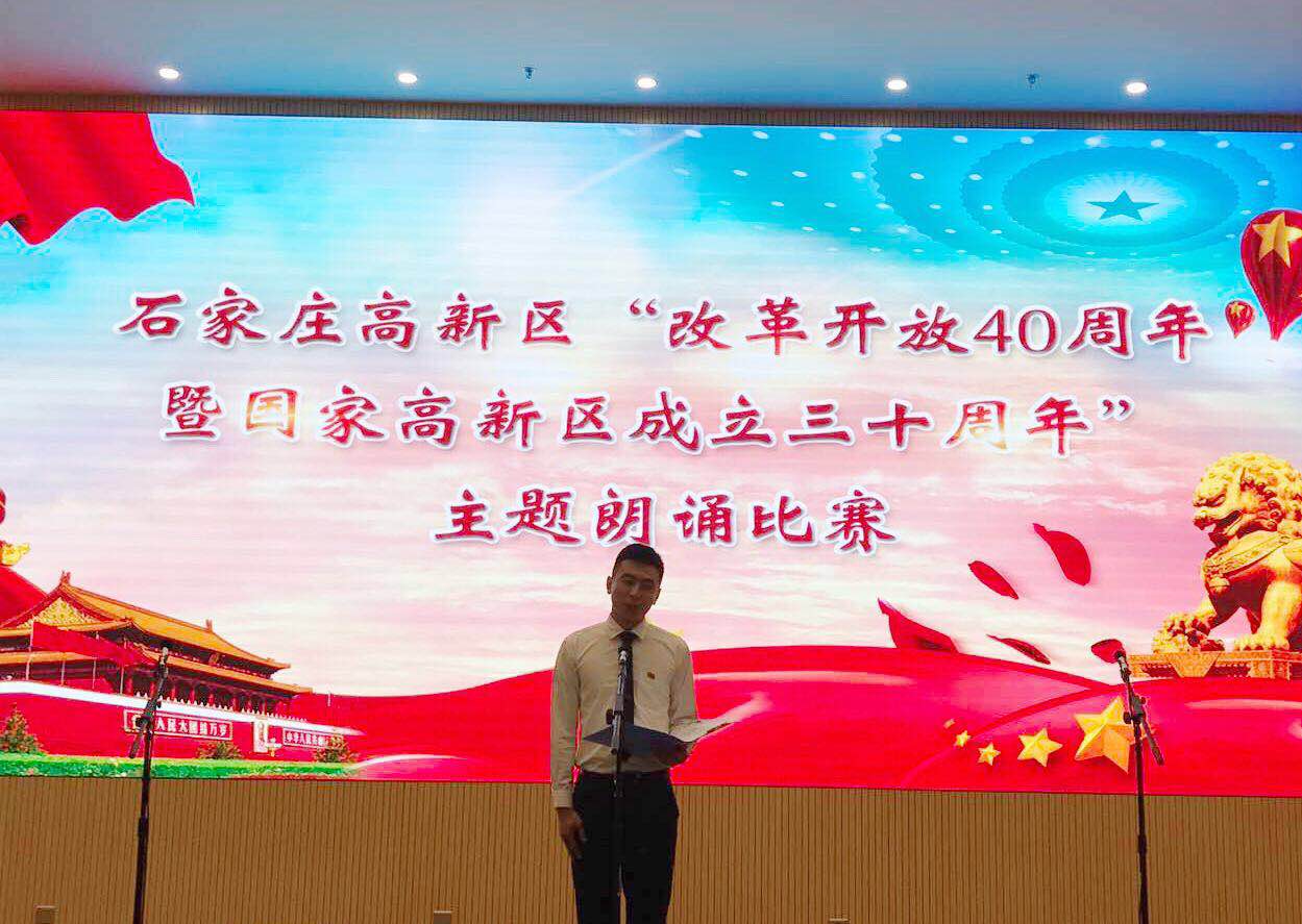 為慶祝我國改革開(kāi)放四十周年暨國家高新區成立三十周年,石家莊高新區于2018年10月17日舉辦了主題朗誦比賽。我公司堅決落實(shí)上級單位的有關(guān)要求,響應號召,積極選派代表參加慶?;顒?dòng),最終王磊同志的朗誦(主題為《盛世中國——獻給偉大的改革開(kāi)放40周年》)聲情并茂,在全區參賽的22支隊伍中脫穎而出,獲得三等獎。