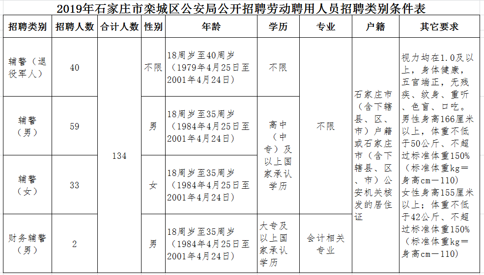 除具備基本條件外,還應具備應聘崗位所需其他條件。具體招聘崗位、招聘數額、招聘條件詳見(jiàn)《2019年石家莊市欒城區公安局公開(kāi)招聘勞動(dòng)聘用人員招聘類(lèi)別條件表》。