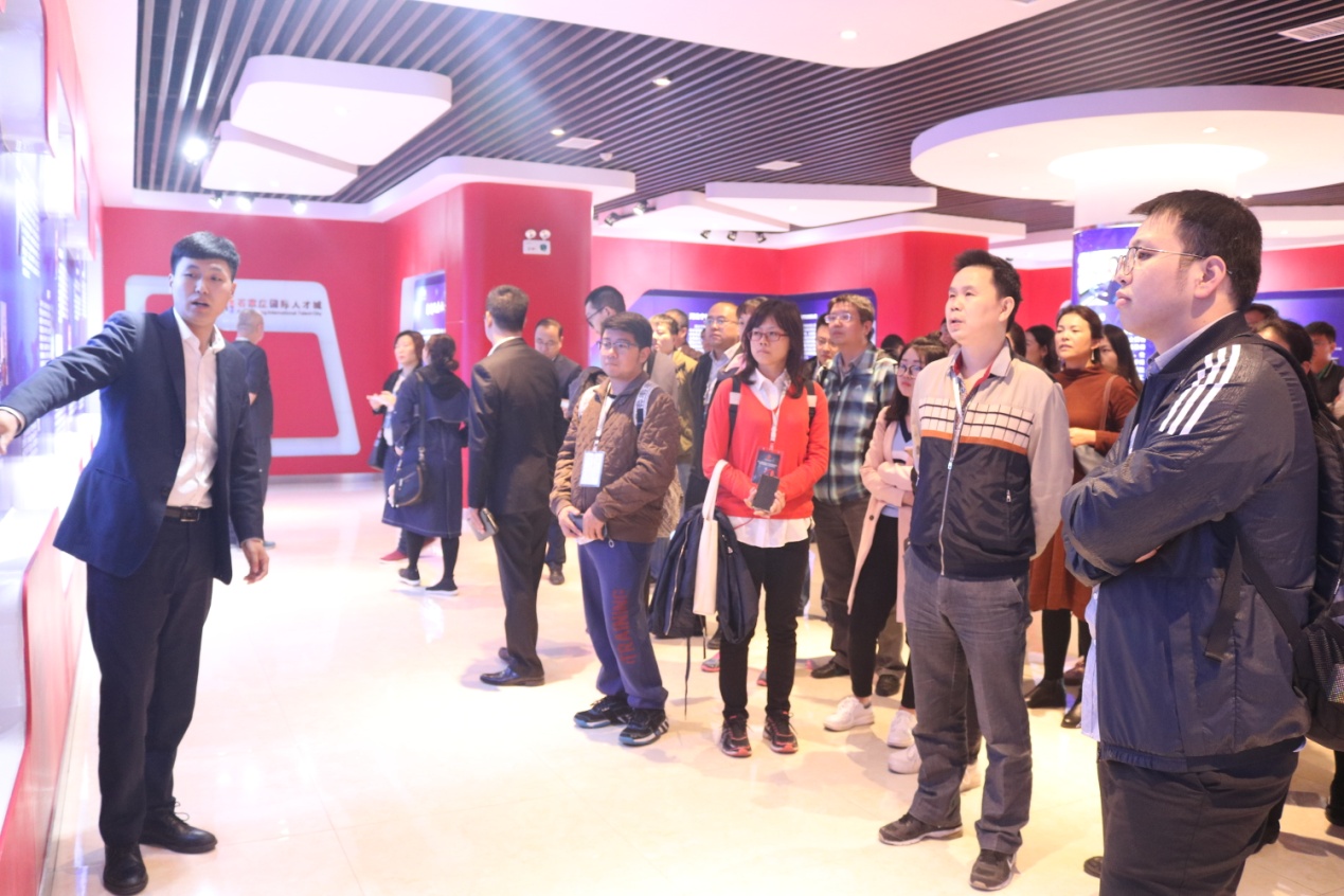 大會(huì )結束后,當日下午,各地留學(xué)人員創(chuàng )業(yè)園、創(chuàng )業(yè)服務(wù)機構、留學(xué)人員企業(yè)代表等參會(huì )嘉賓來(lái)到石家莊國際人才城參觀(guān)考察,石家莊國際人才城才智部部長(cháng)高寶峰及工作人員陪同參觀(guān)。