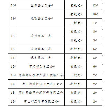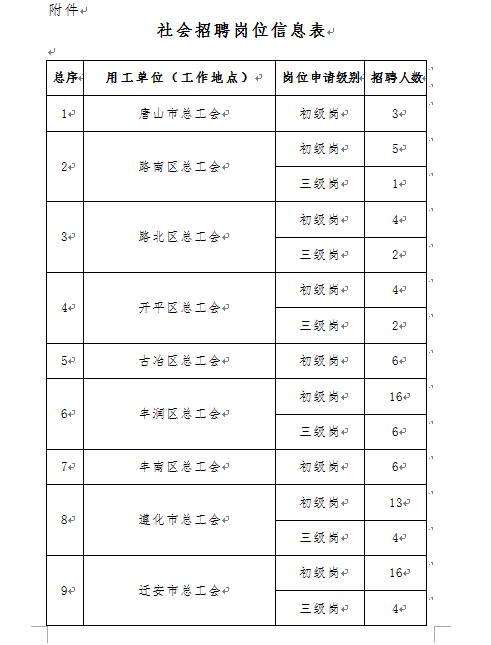 通過(guò)諾招聘(www.noahjob.cn)、諾亞掌上方略、河北人才網(wǎng)、唐山人才網(wǎng)、唐山市職工服務(wù)網(wǎng)站向社會(huì )公開(kāi)發(fā)布招聘公告,具體用工單位、招聘崗位、招聘數量詳見(jiàn)《社會(huì )招聘崗位信息表》。