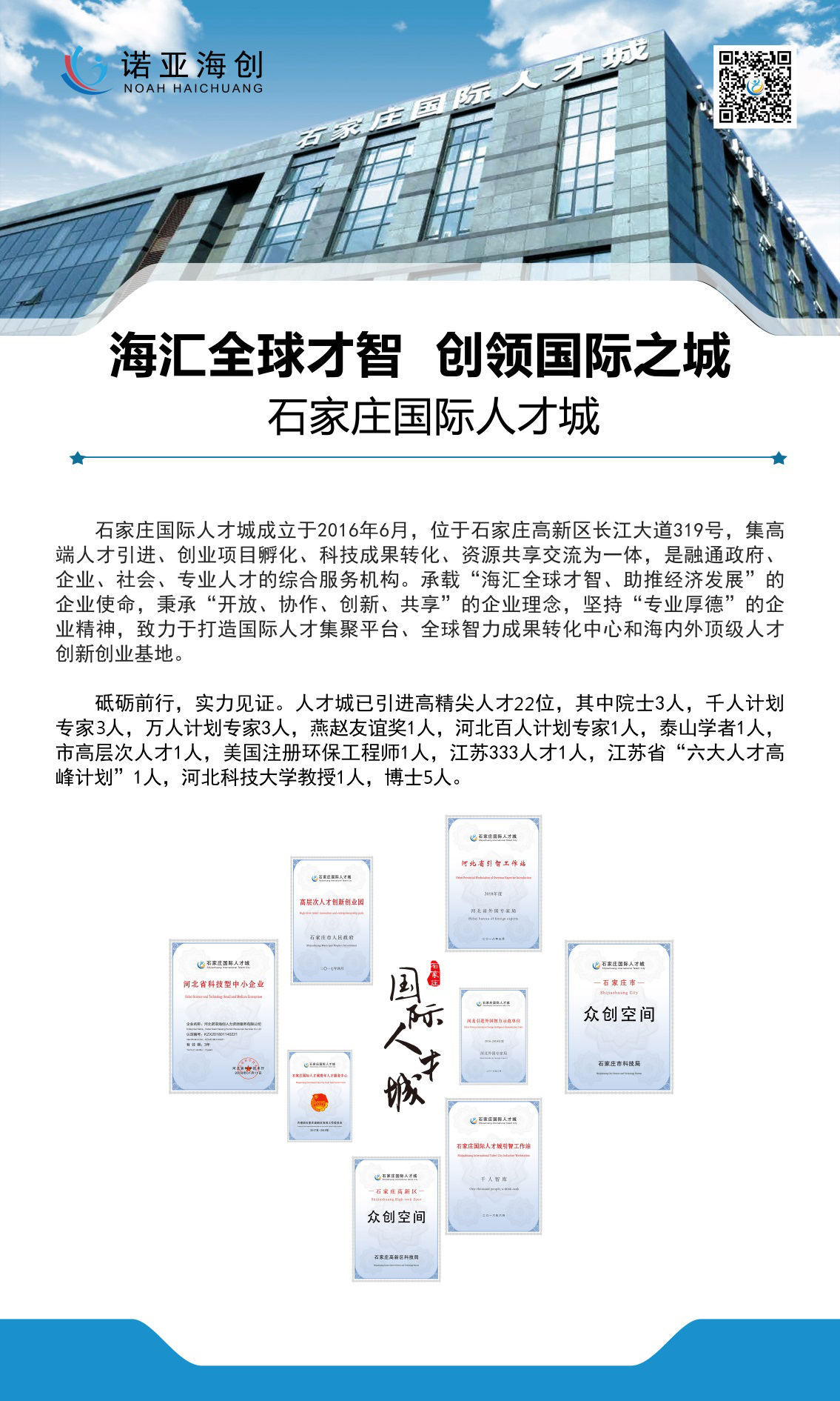 石家莊國際人才城以石家莊高新技術(shù)產(chǎn)業(yè)開(kāi)發(fā)區為基地,接軌京津,輻射華北及全國,是集高端人才服務(wù)、企業(yè)引智服務(wù)、創(chuàng )業(yè)項目孵化、科技成果展示、資源共享交流為一體,融通政府、企業(yè)、社會(huì )、專(zhuān)業(yè)人才服務(wù)機構的綜合服務(wù)平臺,助力產(chǎn)業(yè)升級,為服務(wù)區域經(jīng)濟轉型發(fā)展提供人才支撐和智力保障。石家莊國際人才城于2016年6月正式授牌為河北省外國專(zhuān)家局引智工作站、河北省引進(jìn)外國智力示范單位及“千人智庫”引智工作站,并正式獲批為省“3•20”人才開(kāi)發(fā)服務(wù)平臺和具備高端人才項目孵化特色的眾創(chuàng )空間。