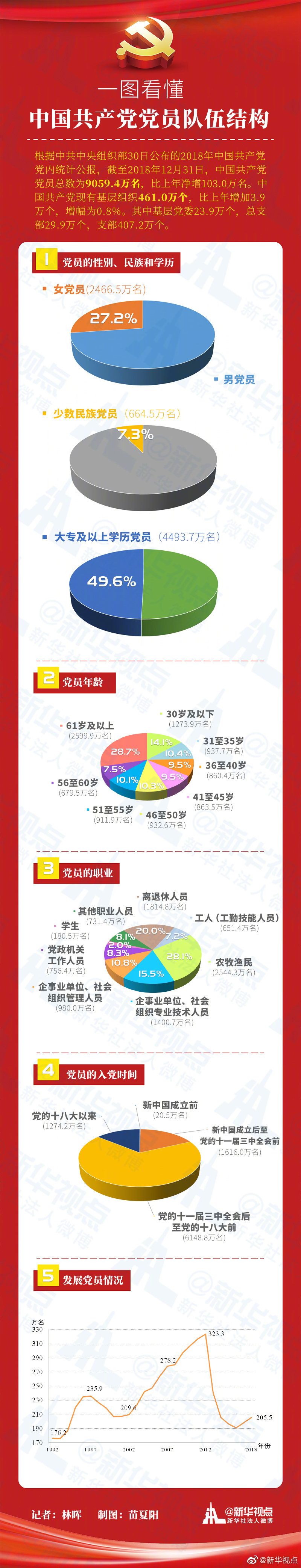 根據中共中央組織部30日公布的2018年中國共產(chǎn)黨黨內統計公報,截至2018年12月31日,中國共產(chǎn)黨黨員總數為9059.4萬(wàn)名。想了解黨員的性別比例、學(xué)歷情況、職業(yè)分布……戳圖